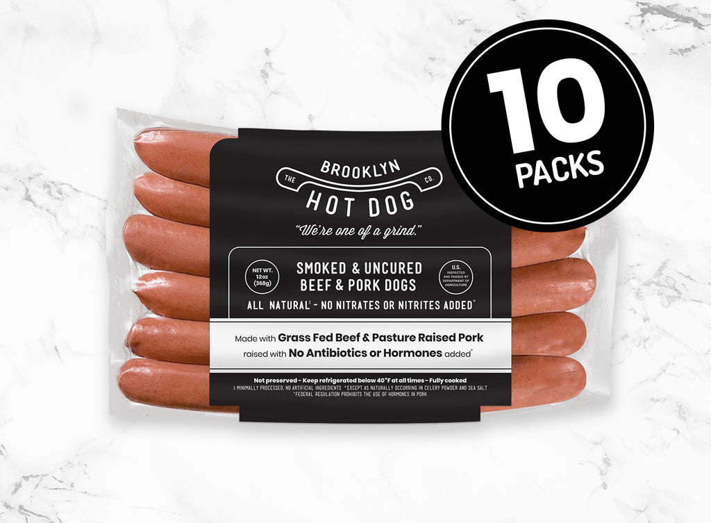 10 packs of Beef & Pork. 6 hot dogs per pack. Total of 60 hot dogs.