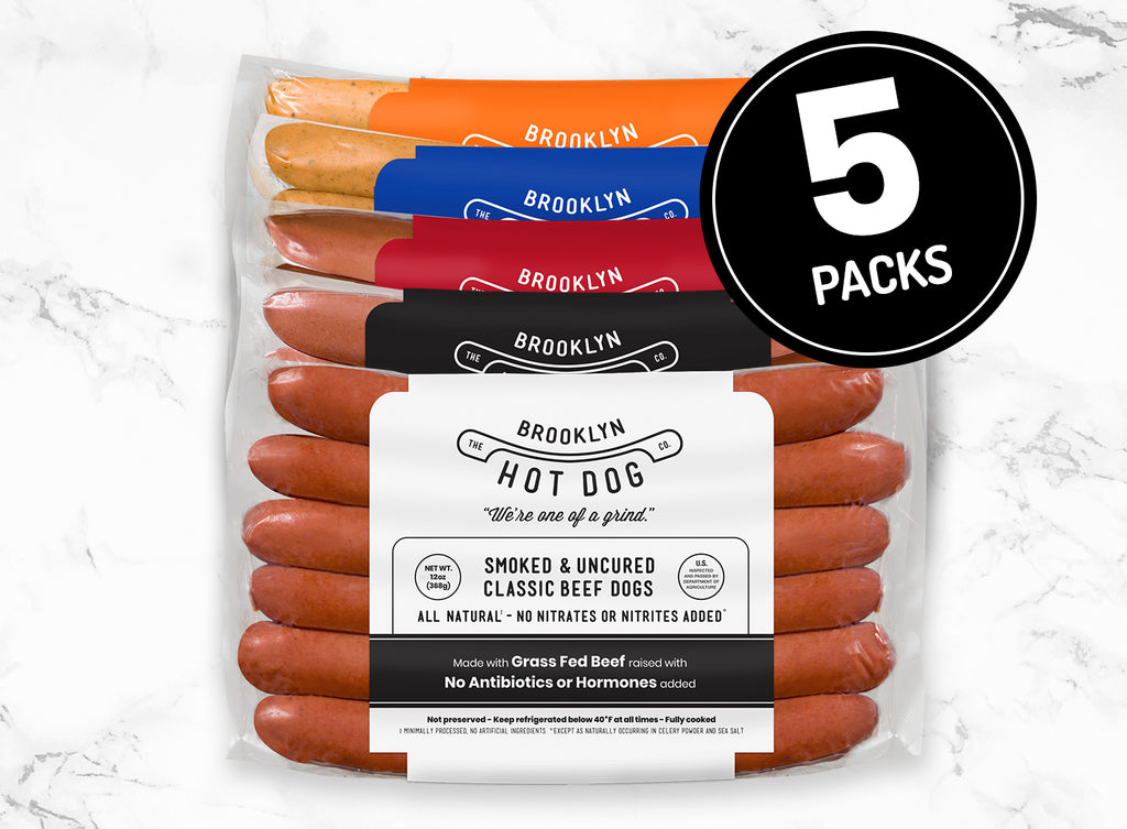 1 pack of Classic Beef. 1 pack of Beef & Pork. 1 pack of Pepperoni. 1 pack of Gyro. 1 pack of Buffalo Chicken. 6 hot dogs per pack. Total of 30 hot dogs.